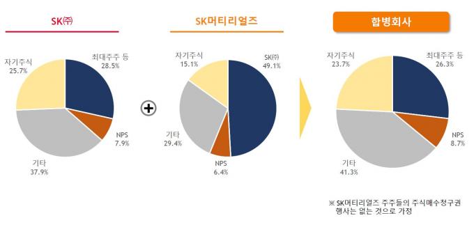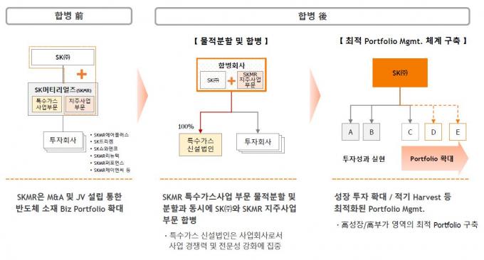 SK㈜가 SK머티리얼즈를 흡수 합병함으로써 SK머티리얼즈를 거치지 않고 곧바로 SK㈜가 배당금을 직접 받는 형태로 지배구조를 개편, 배당 여력을 늘려 투자금을 마련한다는 전략이다.