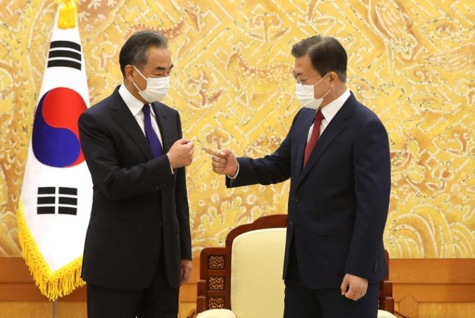한편 왕이 부장은 정 장관과 한·중 외교장관 회담을 한 데 이어 청와대를 찾아 문 대통령을 면담했다. 문 대통령은 왕이 부장에게 "한반도 평화프로세스 추진 과정에서 중국의 역할과 기여를 평가한다"고 말했다. 문 대통령은 "앞으로도 중국의 변함없는 지지를 바라며 왕 위원이 한·중 관계 발전과 한반도 비핵화 및 평화 정착을 위한 우리 정부의 노력을 뒷받침해주는 큰 역할을 해주기를 기대한다"고 당부했다.