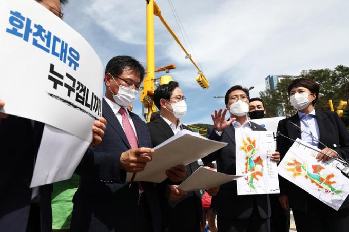 국민의힘 '대장동 진상조사 TF' 소속인 이헌승, 박수영, 송석준, 김은혜 의원 등은 이날 오후 대장동 개발 현장을 둘러봤다. 국민의힘은 다음달 국회 국정감사에서 국토위, 행안위, 정무위를 중심으로 관련 증인들을 대거 증언대에 세울 방침이다.