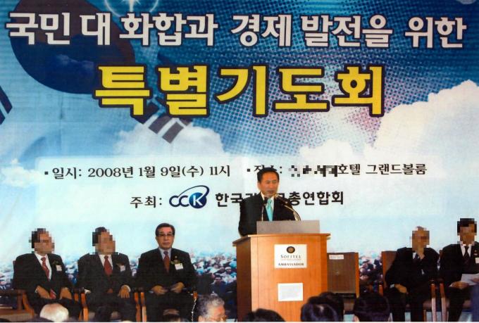 ▲ 2008년 1월 이명박 전 대통령이 당선인 신분으로 서울 M호텔에서 열린 국민대화합과 경제 발전을 위한 특별기도회에 참석해 축사를 하고 있다. 기독교은행 사기 사건 피해자들은 "강모 목사(왼쪽에서 세 번째)가 유력 정치인들과 함께 찍은 사진을 보고 강 목사 말을 믿을 수밖에 없었다"고 말했다. [송창섭 기자]