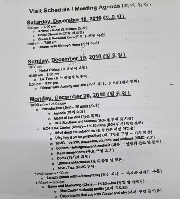 이들은 미국 엔씨포와 협상을 벌이기 위해 2010년 12월 18일부터 21일까지 3박4일간 함께 미국 현지를 방문했다. 당시 사업권 협상에는 엔씨포 엔지니어로 근무하고 있는 재미교포 홍 모 씨가 깊숙하게 개입돼 있었던 것으로 알려졌다.