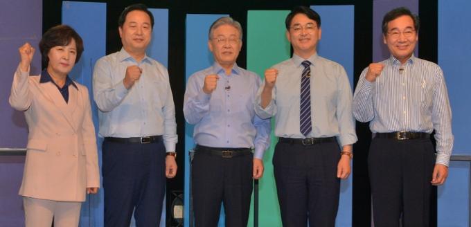 ▲ 더불어민주당 대선 경선후보들이 지난 19일 광주 MBC에서 열린 토론회에 앞서 기념촬영을 하고 있다. 왼쪽부터 추미애, 김두관, 이재명, 박용진, 이낙연 후보. [뉴시스]