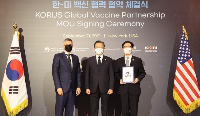 정부는 21일(현지시간) 미국 뉴욕 시내의 한 호텔에서 문재인 대통령이 참석한 가운데 열린 '한·미 백신 협력 협약 체결식'을 개최했다며 이같이 밝혔다.