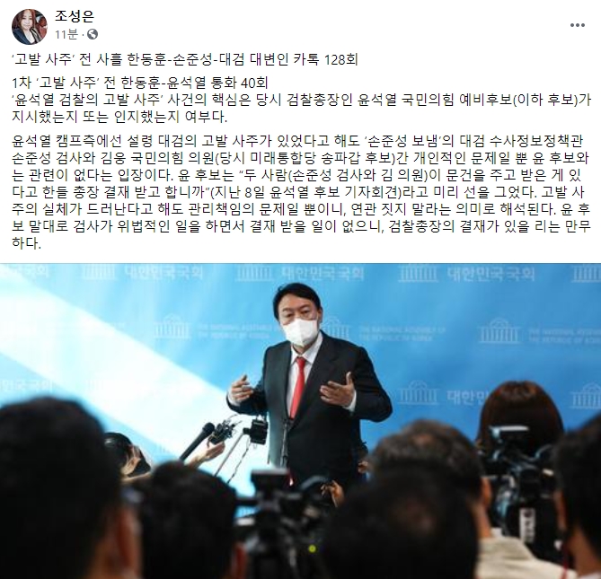 조 씨는 23일 페이스북 글에서 "'윤석열 검찰의 고발 사주' 사건의 핵심은 당시 검찰총장인 윤석열 국민의힘 예비후보(이하 후보)가 지시했는지 또는 인지했는지 여부"라고 했다.