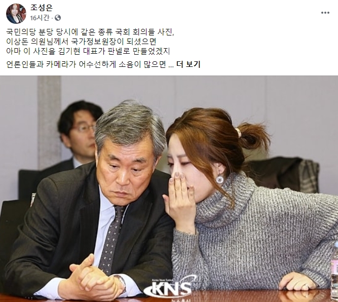 조 씨는 "국민의당 분당 당시에 같은 종류 국회 회의들 사진, 이상돈 (전) 의원님께서 국가정보원장이 되셨으면 아마 이 사진을 김기현 (국민의힘) 원내대표가 판넬로 만들었겠지"라며 "언론인들과 카메라가 (많아) 어수선하게 소음이 많으면 어쩔 수 없이 (귓속말로) 들리도록 이야기 해야 하는데 진짜 어처구니 없는 일"이라고 비난했다.