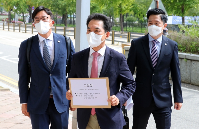 ▲ 박민식 국민의힘 윤석열 캠프 기획실장 겸 특별위원(가운데)이 지난 13일 경기 과천시 정부과천청사 고위공직자범죄수사처에 변호인들과 함께 박지원 국정원장과 제보자 조성은 씨에 대한 국가정보원법 및 공직선거법 위반 혐의 고발장 접수를 위해 들어가고 있다. [뉴시스]