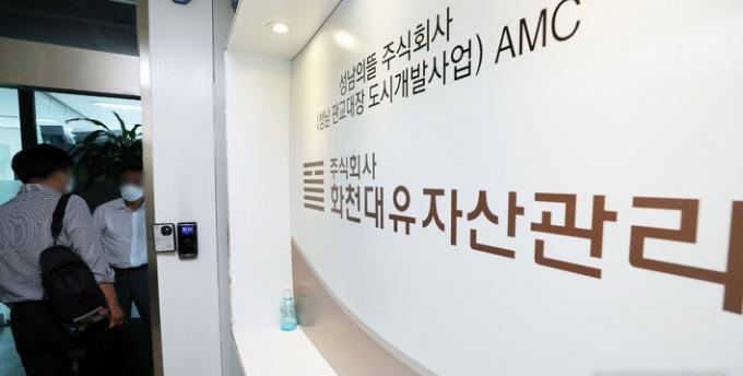 ▲ 경기 성남시 분당구 대장동 개발 사업 특혜 의혹을 받고 있는 화천대유자산관리의 서판교 사무실 입구로 지난 23일 한 관계자가 들어가고 있다. [뉴시스]