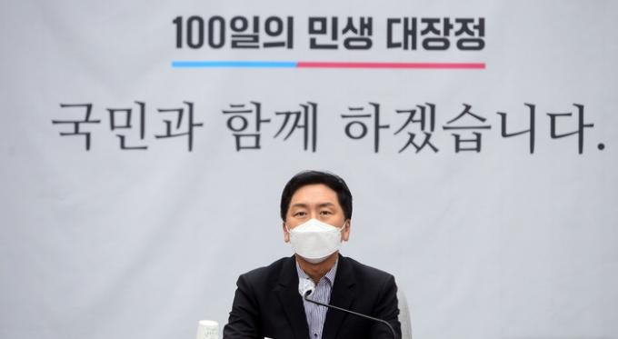 ▲ 국민의힘 김기현 원내대표가 24일 서울 여의도 국회에서 열린 원내대책회의에서 모두발언을 통해 대장동 개발 특혜 의혹에 대한 철저한 진상조사를 촉구하고 있다. [뉴시스]