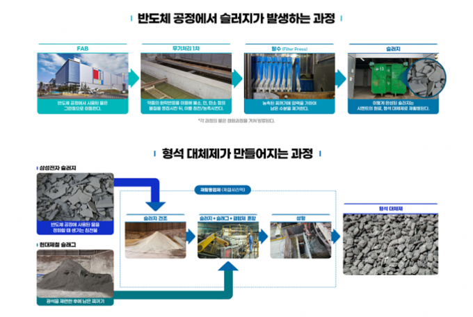 삼성전자와 현대제철은 반도체 제조공정에서 발생하는 폐수슬러지(침전물)를 제철 과정 부원료로 재사용할 수 있는 신기술을 공동 개발했다. 삼성전자와 현대제철, 제철세라믹(재활용업체) 등 3사(社)는 2020년 8월 폐수슬러지 재활용관련 기술협약을 맺고 공동 연구개발을 통해 지난 4월 현대제철 당진제철소에서 30톤의 형석대체품을 사용하여 철강재 생산에 성공했다. 해당 신기술은 2021년 6월 한국환경공단 1차 평가, 8월 국립환경과학원 최종 평가를 거쳐 지난 8월 31일 최종 승인되었다. 국립환경과학원에서는 2016년 7월 재활용환경성평가 제도가 신설 된 후 가장 모범적인 사례로 평가했다. 형석은 전량 해외(남미, 중국 등) 수입에 의존 하고 있는 광물이다. 현대제철에서는 연간 약 2만 톤의 형석을 수입해 사용하는데, 이르면 오는 10월 말부터 약 1만여 톤을 폐수슬러지 재활용품으로 대체하고 향후 점차 사용량을 늘려간다는 계획이다. '폐기물을 활용한 대체물질 개발'은 정부의 자원순환 정책에 부응함과 동시에 기업, 관계기관 협업을 통해 창출된 '자원순환형 ESG'의 모범 사례다.