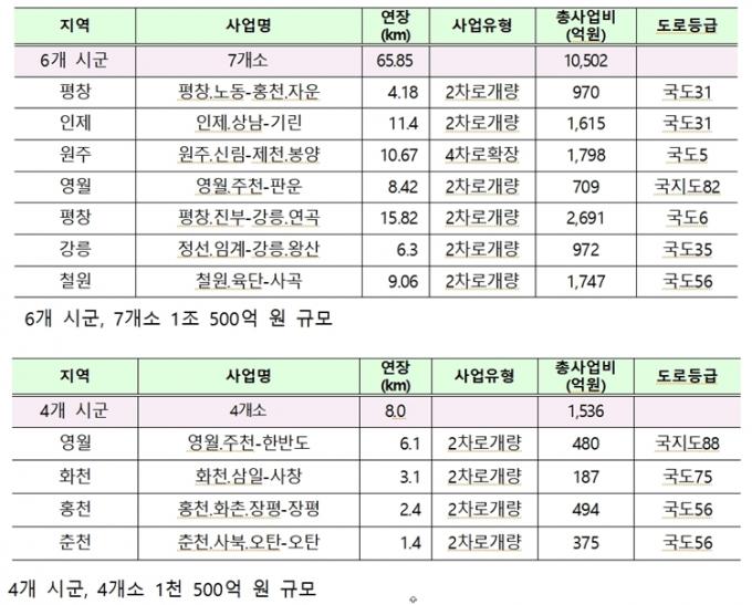 강원도의 총 21개소 사업이 후보에 올랐다. 이 중 17개소는 일괄 예비타당성 조사 대상에 해당돼 7개소는 이번 확정 이전에 통과됐다. 여기에 500억 원 미만 사업 4개소가 이번에 전부 반영됐다.
