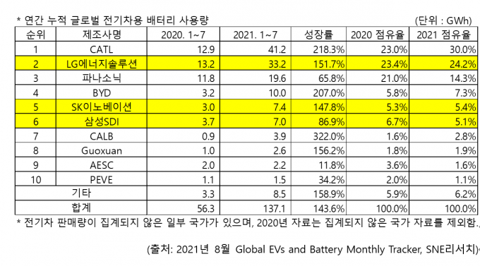SK이노베이션은 2.4배 급증하면서 지난해 같은 기간보다 순위가 하나 오른 5위를 기록했다. 점유율은 5.4%를 유지했다. 삼성SDI는 7.9GWh로 77.9% 증가했지만, 순위는 6위로 작년보다 두 계단 내려갔다. 점유율도 6.6%에서 4.9%로 줄었다.