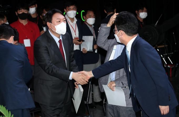 ▲ 지난 7일 서울 강서구 ASSA빌딩 방송 스튜디오에서 열린 국민의힘 대선 경선 후보 '체인지 대한민국, 3대 약속' 발표회에서 윤석열 , 유승민 후보(오른쪽)가 악수하고 있다. [뉴시스]