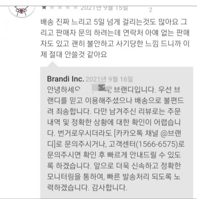 브랜디 관계자는 "특정 시간대 주문량이 갑작스럽게 몰리거나, 배송업체 사정에 따라 배송 지연 등이 발생할 수 있다. 배송이 지연된 경우는 원인이 다양해 특정지어 설명할 수 없지만 이런 상황을 방지하기 위해 다양한 배송 시스템을 적용해 개선해 나갈 수 있도록 하고 있다"고 말했다.