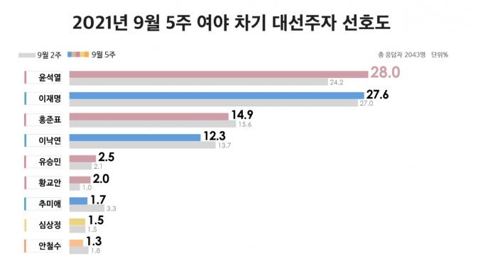 국민의힘 대선후보 선호도에서는 홍 의원이 32%, 윤 전 총장이 27.2%를 기록했다. 국민의힘 지지층에선 윤 전 총장이 54.7%로 홍 의원(32.9%)을 21.8%p 앞섰다. 직전 조사(9월 14,15일 실시)에서 둘 격차는 16.4%p였다.