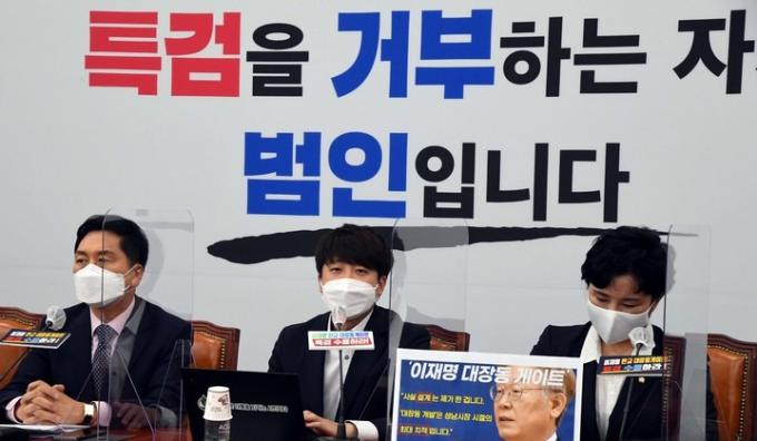 이 대표는 30일 국회에서 열린 '대장동 게이트 특검법 수용 촉구 긴급기자회견'에서 "특검으로 의혹을 규명해도 부족한 판에 민주당과 이 지사가 특검을 거부하는 이유는 뭐냐"며 "특검 거부하는 사람들이야 말로 첫째 의심대상자이자 범인"이라고 주장했다. 특검 수용을 압박한 것이다.