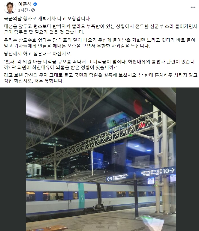 이 대표는 "국군의날 행사로 새벽 기차 타고 포항간다"며 도저히 참을 수 없어 기차 안에서 글을 남긴다고 했다.