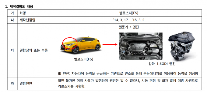 이번 리콜 대상은 2014년 3월 17일~2016년 3월 2일에 제작된 벨로스터(FS) 감마1.6 GDI 엔진 장착 차량이다.