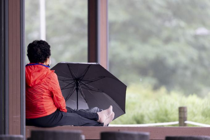 ▲ 이슬이 맺히고 가을이 시작된다는 절기상 백로(白露)인 지난달 7일 서울 마포구 하늘공원. 한 시민이 의자에 앉아 비내리는 풍경을 바라보고 있다. [문재원 기자]