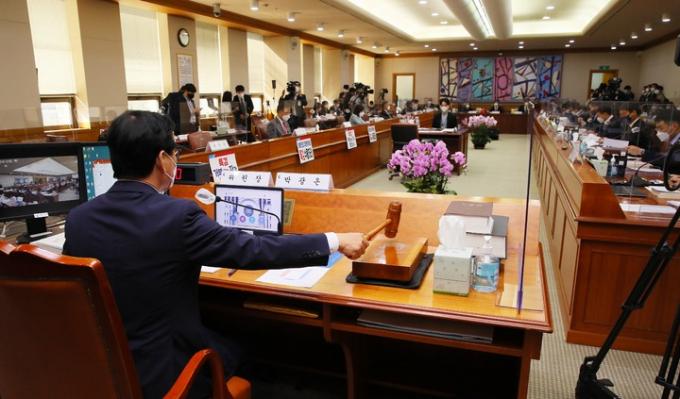 ▲ 2021년 국회 국정감사가 시작된 1일 서울 서초구 대법원에서 열린 법제사법위원회 국감에서 더불어민주당 소속 박광온 위원장(왼쪽)이 개의를 선포하고 있다. [뉴시스]
