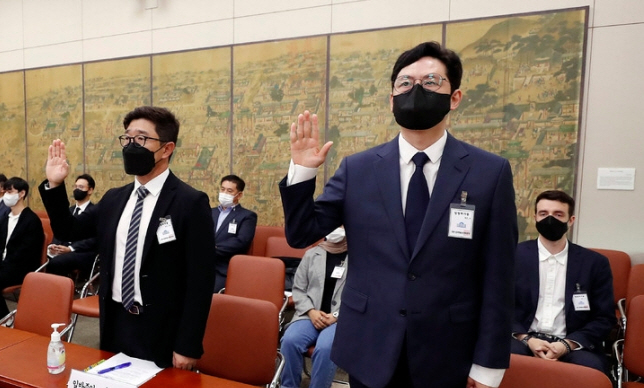 ▲ 김준구 네이버웹툰 대표(오른쪽)와 이진수 카카오엔터테인먼트 대표(왼쪽)가 1일 열린 국회 문화체육관광위원회 국정감사에 증인으로 출석해 선서하고 있다.[공동취재사진]
