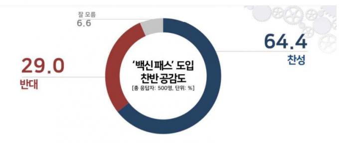 리얼미터가 YTN 의뢰로 지난 1일 전국 만 18세 이상 500명을 대상으로 백신 패스 도입에 대한 의견을 물은 결과, 전체 응답자 중 64.4%는 '단계적 일상 회복과 백신 접종률 제고를 위해 찬성한다'고 밝혔다. '개인 사정과 기본권 침해 우려를 고려해 반대한다'는 응답은 29.0%에 그쳤다. '잘 모르겠다'는 6.6%였다.