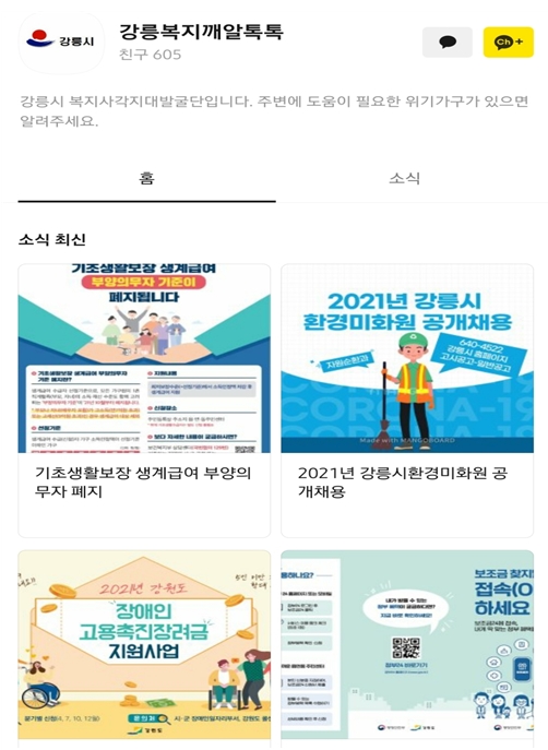 강릉시 희망복지지원단이 2018년 10월 시작한 '강릉복지 깨알톡Talk'은 채널 추가 수가 200건에서 현재 600건으로 늘었다. 2021년부터 복지 관련 카드뉴스를 제작하고 전 부서의 취약계층 대상사업(일자리, 에너지 등)을 채널을 통해 홍보하는 등 복지융합서비스를 실현하고 있다.