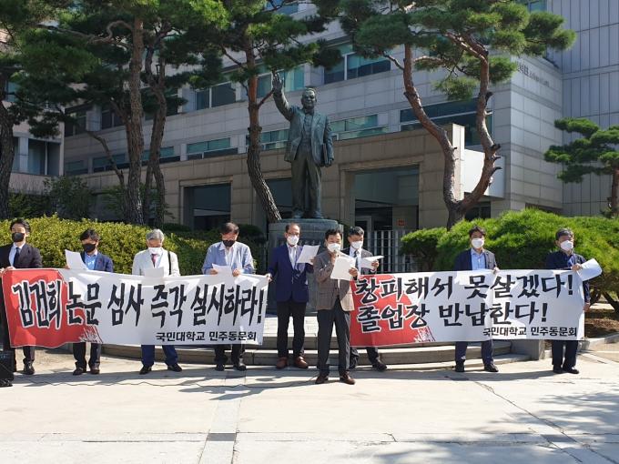 ▲ 지난 1일 국민대학교 민주동문회가 국민대 해공 신익희 선생의 동상 앞에서 김건희씨의 논문심사를 촉구하고 있다. [이준엽 기자]
