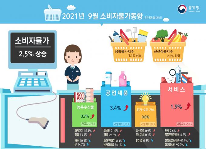 통계청이 6일 발표한 소비자물가 동향에 따르면 9월 소비자물가지수는 108.83(2015년=100)으로 전년 동월 대비 2.5% 상승했다.