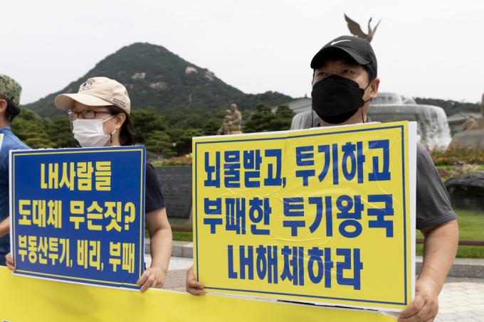 ▲ 지난 7월 2일 서울 청와대 앞에서 부동산적폐청산시민행동 관계자들이 '문재인 대통령은 부동산 투기 의혹 임명직 공무원 파면하고, LH해체하라' 기자회견을 하고 있다. [문재원 기자]