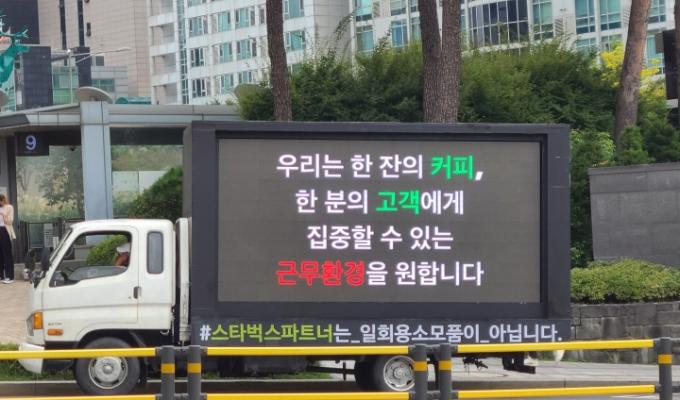 스타벅스커피코리아(이하 스타벅스)의 일부 직원들이 근로 조건 및 처우 개선을 요구하는 트럭 시위를 7일 시작했다.