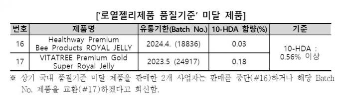 이 두 제품의 10-HDA 함량은 각각 0.03%, 0.18% 수준으로 기준치가 가장 낮은 '로열젤리제품'(0.56% 이상) 품질에도 미치지 못했다.