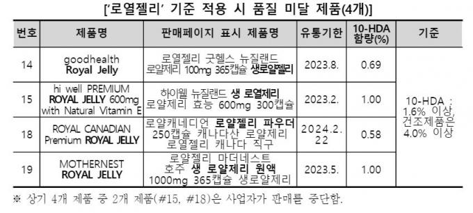 또 해외직구 7개 중 4개 제품이 로열젤리 기준에 미치지 못하면서도, 소비자들이 오인할 수 있는 제품명을 사용하는 것으로 조사됐다. 4개 제품은 모두 '로열젤리' 기준(1.6% 이상, 건조제품 4.0% 이상)을 충족하지 못했다.