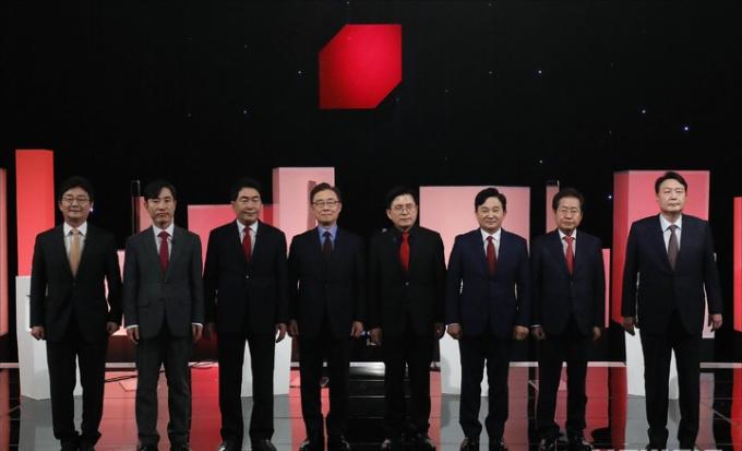 ▲ 국민의힘 유승민(왼쪽부터), 하태경, 안상수, 최재형, 황교안, 원희룡, 홍준표, 윤석열 대선 경선후보가 지난 5일 서울 여의도 한국방송공사 스튜디오에서 제6차 방송토론회에 앞서 기념촬영하고 있다. [뉴시스] 당 선거관리위원회는 이날 국회에서 2차 예비경선(컷오프) 결과를 발표했다. 2차 컷오프 결과에는 책임당원 선거인단 30%, 여론조사 70%가 반영됐다.
