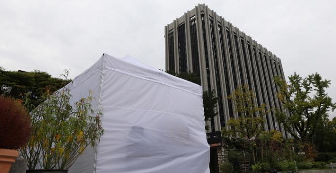 ▲ 지난 7일 오후 서울 종로구 정부서울청사 인근 세종로 공원에 코로나19 대응 전국 자영업자비상대책위원회 관계자들의 농성용 천막이 설치돼 있다. [뉴시스]