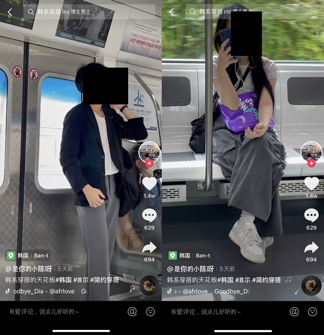 글과 함께 공개된 사진은 해당 누리꾼이 한 중국인의 더우인 계정에 올라온 영상을 캡처한 것으로 한국의 길거리나 지하철 등에서 몰래 한국인을 촬영한 것이다. 이 계정에는 153개의 영상이 올라와 있다.