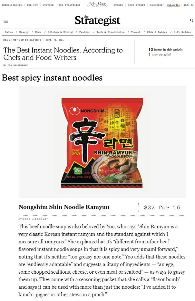 지난달 30일, 뉴욕매거진에서 운영하는 웹사이트 더 스트래티지스트(The Strategist)는 "셰프와 푸드라이터가 말하는 최고의 라면(The Best Instant Noodles, According to Chefs and Food Writers)"이라는 기사를 게재했다.