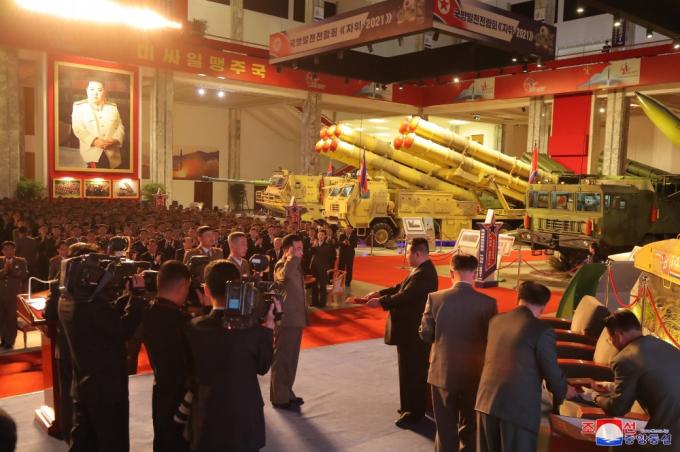 북한이 국방발전전람회를 개최한 것은 이번이 처음이다. 전람회장에는 김정은 위원장이 원수복을 입은 초상화 사진과 "미싸일(미사일) 맹주국"이라는 구호가 걸려 있어 눈길을 끈다.
