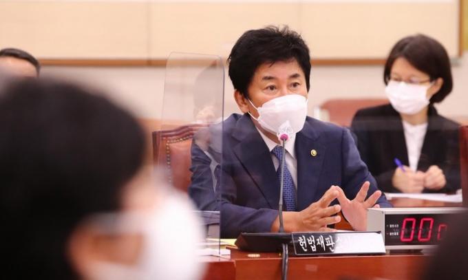 ▲박종문 헌법재판소 사무처장이 12일 오전 국회에서 열린 법제사법위원회의 헌법재판소, 헌법재판연구원에 대한 국정감사에서 의원들의 질문에 답변하고 있다. [뉴시스]