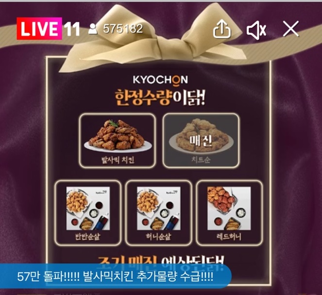 특히 교촌치킨의 전 메뉴를 구매할 수 있는 전메뉴 금액권이 아닌, 신제품 발사믹치킨만을 구매할 수 있는 단일 메뉴권임에도 준비된 1만 5000개의 수량이 방송 당일 완판됐다.