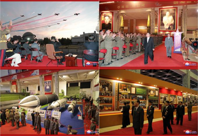 또한 전시장 중앙부에는 원수복을 입은 김정은 사진과 '주체의 핵강국'과 '미싸일 맹주국' 구호가 걸려 있었다. 각종 무기가 전시된 곳곳에는 역시 원수복을 김정은과 함께 찍은 박정천 당중앙위 정치국 상무위원 등 미사일 개발 관련 공로자들의 사진이 걸려 있었다.