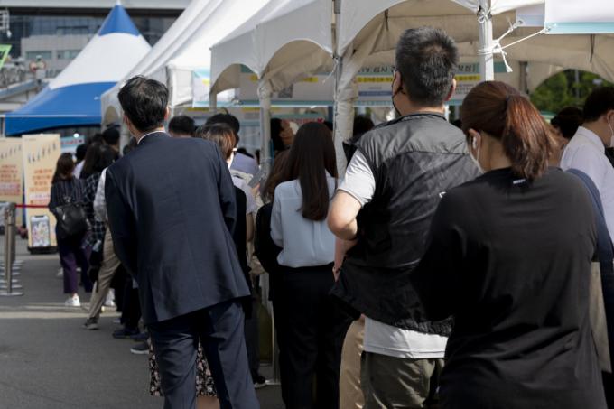 ▲ 추석 연휴가 끝난 지난 9월 23일 서울역 임시선별소에서 시민들이 검사를 받기 위해 줄지어 서 있다. [문재원 기자]