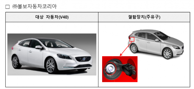 V40의 캡리스 주유구는 별도의 마개가 없어 연료탱크에 주유기를 바로 넣고 주유할 수 있는 구조다. 이때 국토부는 "볼보차코리아는 세차를 할 때나 비가 오면 연료탱크로 물이 흘러들어가 시동 꺼짐 문제가 발생한다는 것을 발견했다"며 자발적 리콜 배경을 설명했다.
