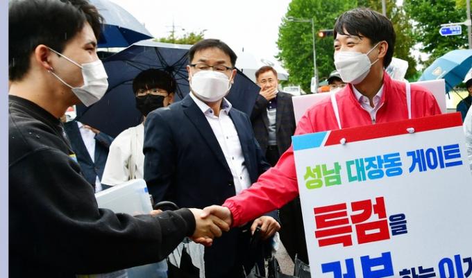 ▲ 국민의힘 이준석 대표(오른쪽)가 지난 11일 광주 북구 전남대학교 후문에서 '대장동 게이트 특검 촉구' 도보행진을 하고 있다. [뉴시스]