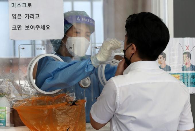 ▲ 서울 중구 서울역광장에 마련된 선별진료소에서 의료진이 검체를 채취하는 모습. [뉴시스]