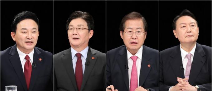 ▲ 13일 제주시 도남동 KBS제주방송국에서 열린 제주합동토론회에 참석한 국민의힘 대권주자 4인. 왼쪽부터 원희룡·유승민·홍준표·윤석열 후보. [뉴시스]