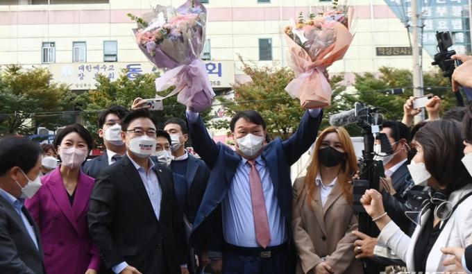 ▲ 국민의힘 대선 경선후보인 윤석열 전 검찰총장이 14일 경기도 수원 장안구 경기도당에서 열린 '경기도당 주요당직자 간담회' 참석에 앞서 지지자들에게 인사하고 있다. [뉴시스]
