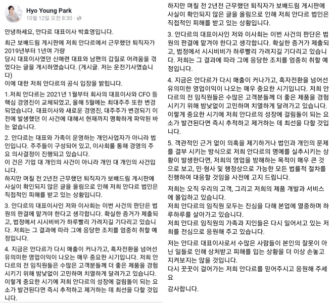 이에 대해 안다르 박효영 공동대표는 지난 12일 개인 SNS를 통해 공식 입장문을 올렸다.