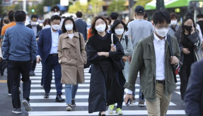 ▲시민들이 쌀쌀한 날씨를 보인 지난 13일 오전 서울 종로구 광화문네거리에서 몸을 웅크린 채 발걸음을 옮기고 있다. [뉴시스]