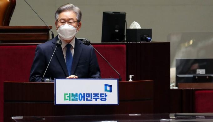 ▲더불어민주당 이재명 대선후보가 지난 15일 서울 여의도 국회에서 열린 의원총회에서 발언하고 있다. [뉴시스]