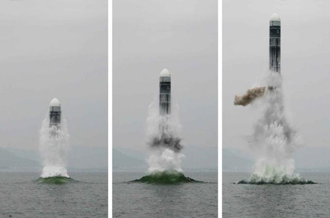 ▲ 북한 국방과학원이 2019년 10월 2일 오전 새형의 잠수함탄도탄 '북극성-3형' 시험발사에 성공했다고 발표하며 공개한 시험발사 사진들. 이번 SLBM 발사는 그로부터 2년 만에 이뤄진 것이다. [노동신문 캡처]